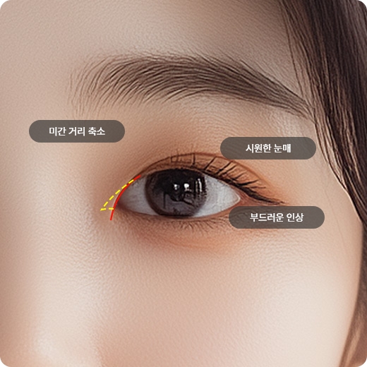 눈 앞쪽의 몽고주름을 재배치 혹은 제거하여 눈앞의 공간을 터줍니다. <br>