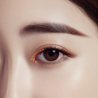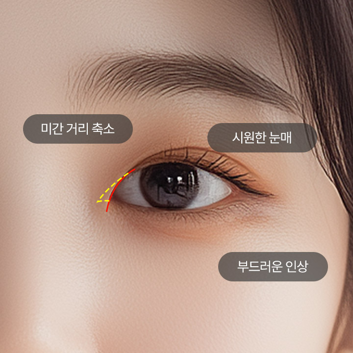 눈 앞쪽의 몽고주름을 재배치 혹은 제거하여 눈앞의 공간을 터줍니다.