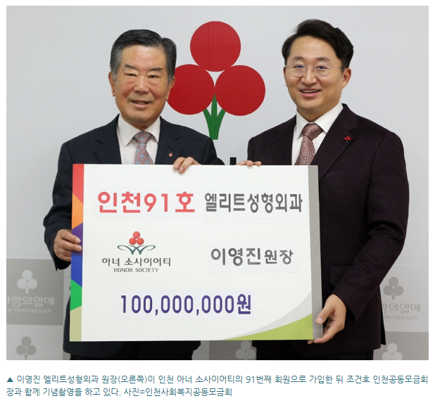 엘리트성형외과 이영진 원장이 15일 인천사회복지공동모금회의 1억원 이상 고액 기부자 모임인 ‘아너 소사이어티’의 91번째 회원으로 가입했다.