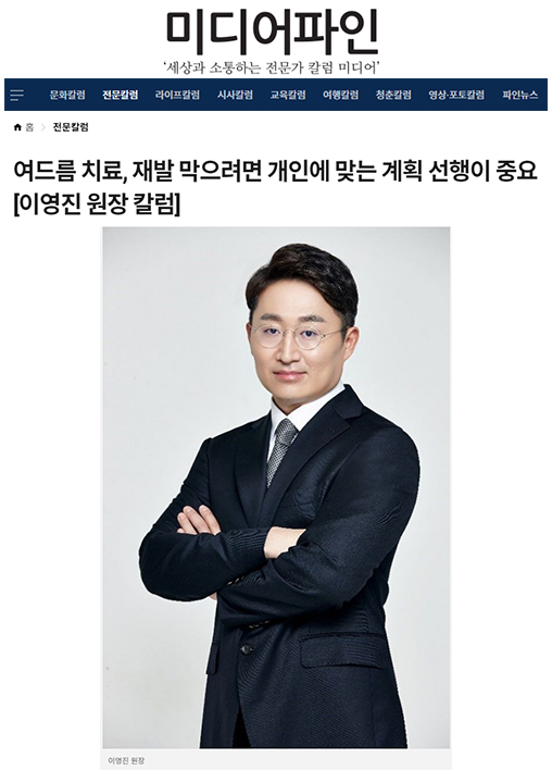 이처럼 치료 방법은 다양하다. 그 만큼 각자의 여드름 유형에 따라서 적합한 방법이 달라질 수 있다. 현재 얼굴에 여드름이 있는 경우, 여드름 자국과 흉터 등 복합적인 피부 문제점이 분포하고 있는 경우 등 증상도 다양하기에 이에 맞는 선택이 필요하다.(인천 엘리트성형외과 이영진 원장)