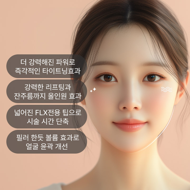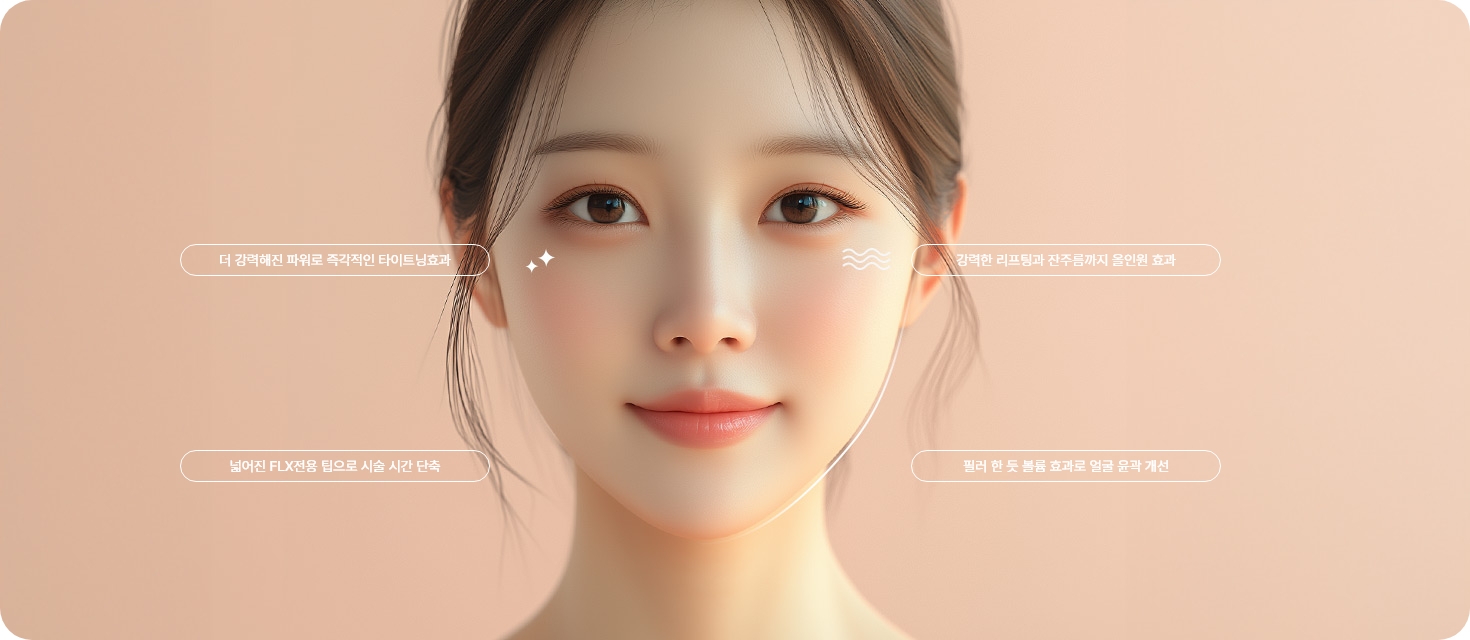 FLX는 써마지의 최신 모델로, 기존 모델 대비 빠르고 효과적으로 고주파를 전달해 시술 시간과 통증이 감소되었습니다.